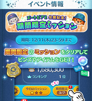 ズートピア2公開記念!期間限定ミッション一覧・報酬まとめ ![]() 開催期間:2025年12月5日11:00~12月11日23:59 |