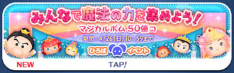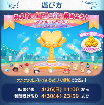 LINEディズニー ツムツム(Tsum Tsum)にて開催される、2026年4月ひろばイベント「みんなで魔法の力を集めよう!~マジカルボム50億個」の攻略完全まとめです。