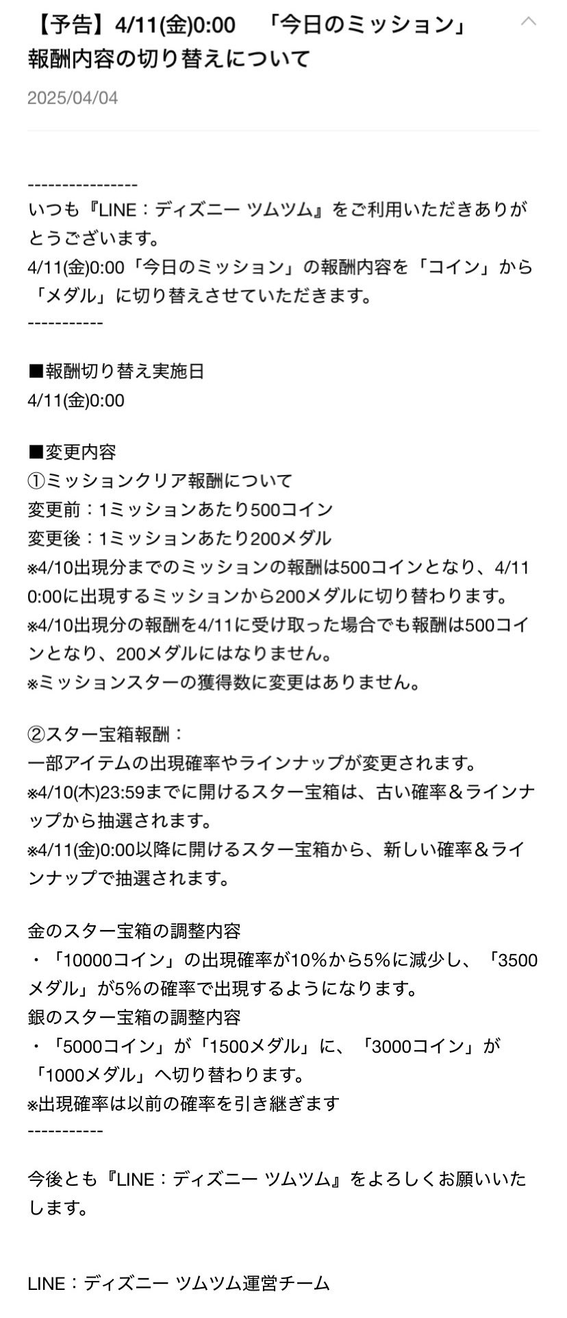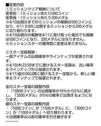 アプリ内のお知らせで4月11日からミッションクリア報酬とスター宝箱報酬の変更が予告されてますね