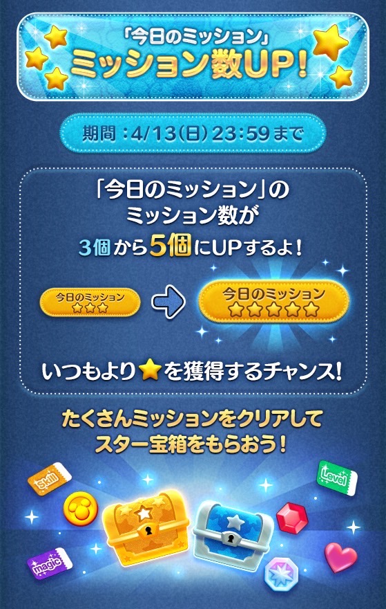 4/11(金) 0:00~4/13(日) 23:59まで、スターミッションが3個 → 5個になっています。