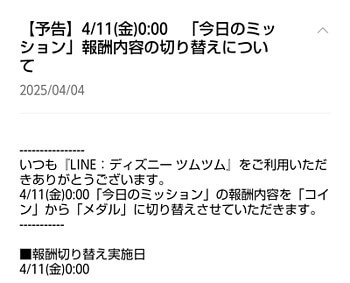 2025年4月11日0時より、今日のミッション報酬が変わります。