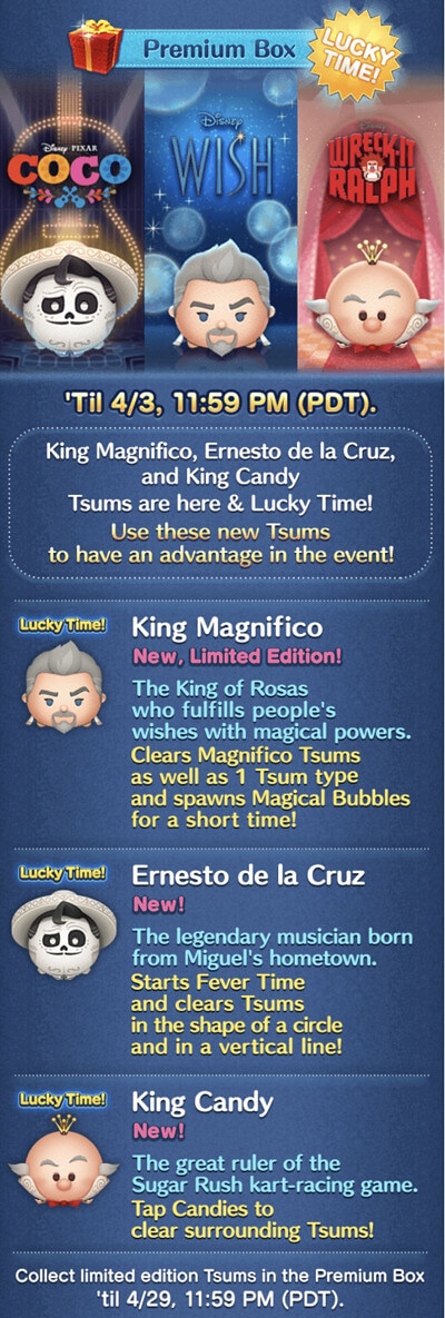 4月は18〜20日にスター・ウォーズの最大イベント「スター・ウォーズ・セレブレーション」が17年ぶりに日本で開催されるので、新ツムと言わないまでも、復刻はあるんじゃないでしょうか……。