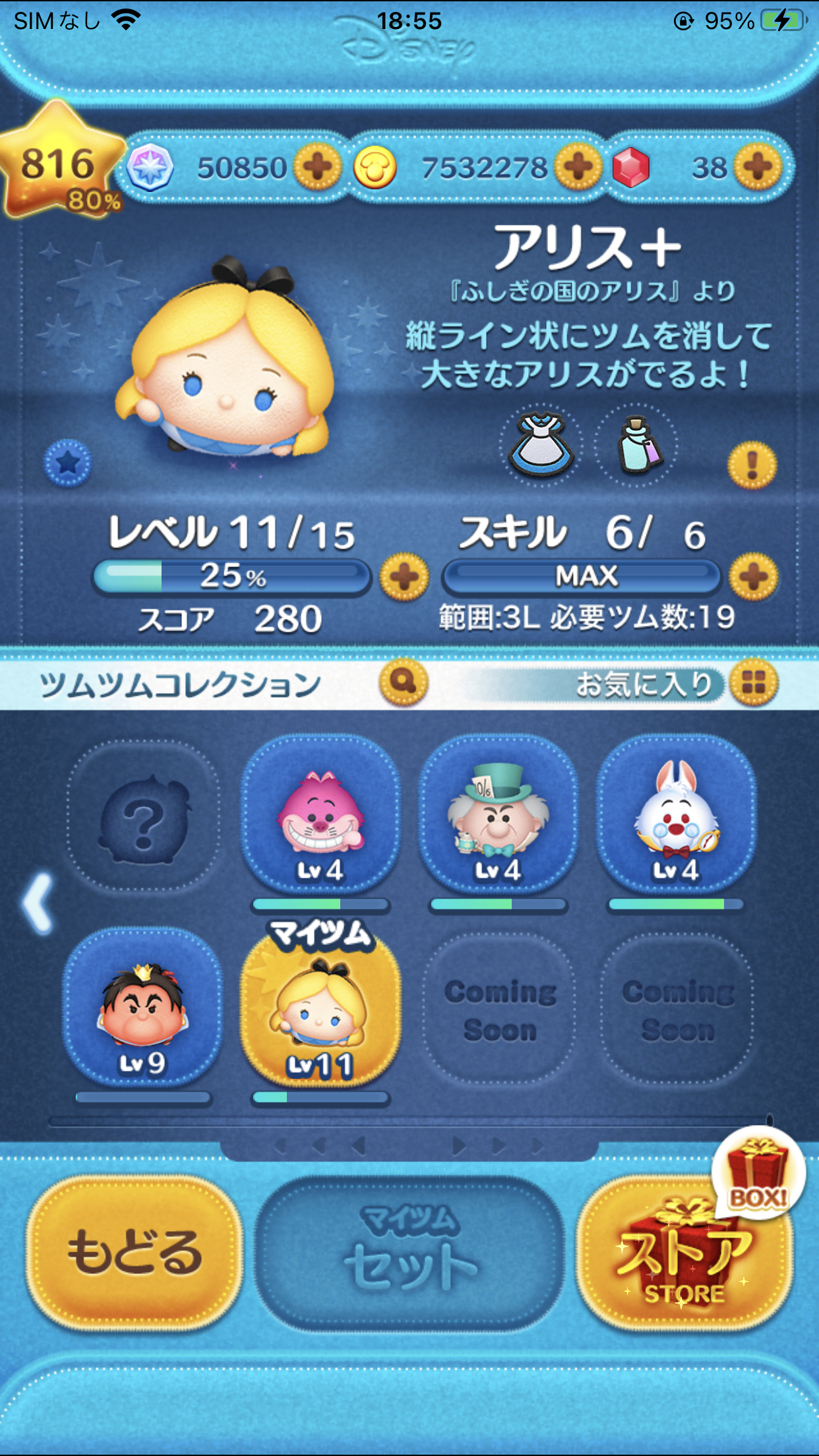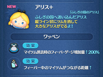 アリス+は、縦ライン状にツムを消して大きなアリスがでるよ!という消去系&大ツム系。