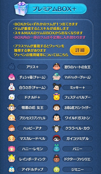 | 新ツム情報 | その他ラインナップ | プレミアムBOX+の確率 |