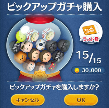 今回のピックアップガチャも15体のツムが入っています。
