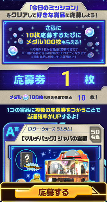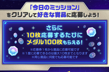 今日のミッションを1個クリアごとに1枚、1日に最大3枚の応募券がもらえます。
