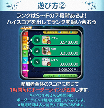 LINEディズニー ツムツム(Tsum Tsum)にて、2025年5月に開催される「スコアチャレンジイベント」のSランク~Bランクのボーダー予想と結果推移速報です。