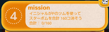 このミッションは、イニシャルがPのツムでスターボムを合計160個消すとクリアになります。