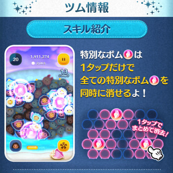 | スキル名 | ツムを1種類消したあと少しの間特別なボムがふってくるよ! |