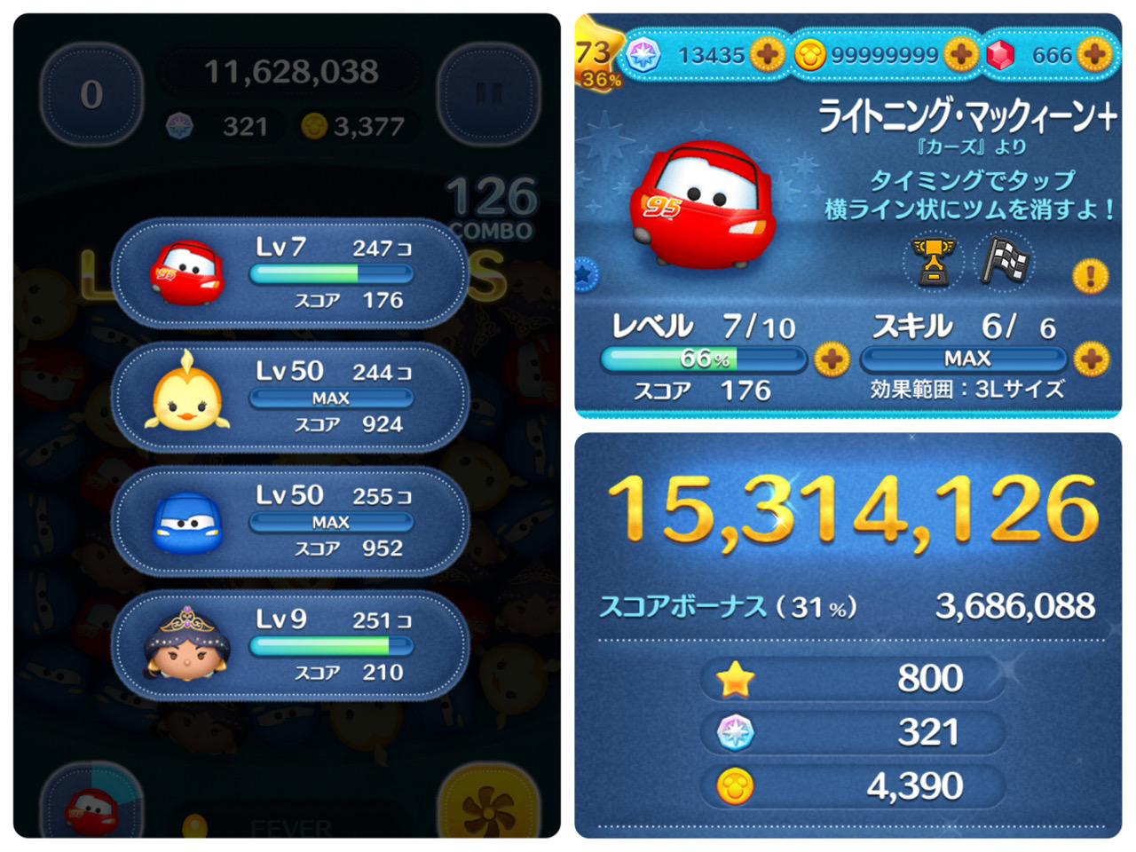 ライトニング・マックィーン+は、タイミングでタップ 横ライン状にツムを消すよ!という消去系。