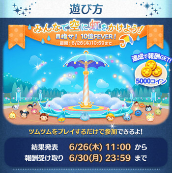 LINEディズニー ツムツム(Tsum Tsum)にて開催される、2025年6月ひろばイベント「みんなで空に虹をかけよう~目指せ10億フィーバー~」の攻略完全まとめです。