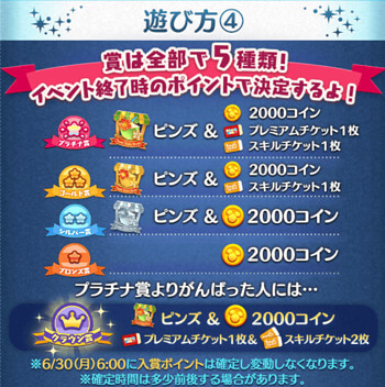 | プラチナ賞 | プラチナピンズ 2,000コイン プレミアムチケット 1枚 スキルチケット 1枚 |