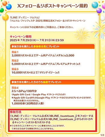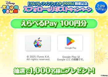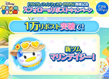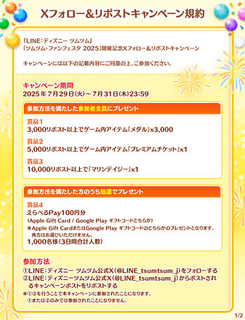 2025年7月29日より、ツムツムファンフェスタ2025開催記念として「Xフォロー&リポストキャンペーン」が開催されています。