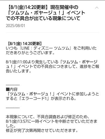 今回の不具合は、2025年8月イベント「ツムツムボヤージュ」を開こうとするとエラーコード1が出るというものです。