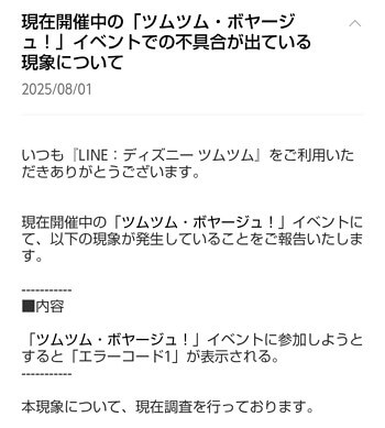 2025年8月1日11時より、「ツムツムボヤージュ」イベントを開こうとすると、エラーコード1が出るという不具合が発生しています。