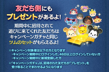 このキャンペーンは、新規はもちろん過去にツムツムをプレイしていた友人に招待することで、報酬がもらえるというもの。