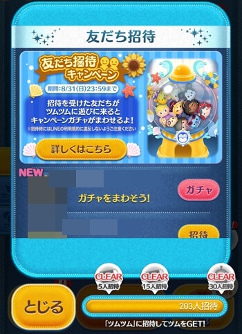 なんと、招待した側は専用のガチャが引けるようになり、招待された側はツムセットが貰える太っ腹キャンペーンです。