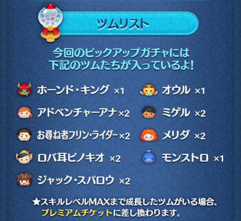 また、対象ツムの中でスキルマのツムがいる場合、プレミアムチケットに変換されます。