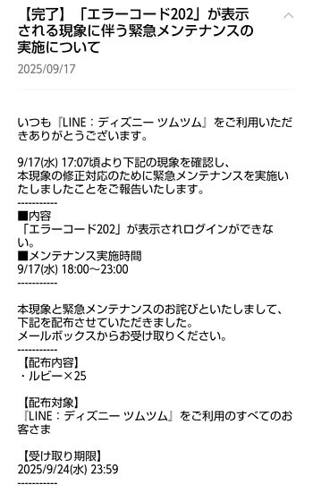 2025年9月17日夕方頃に、エラーコード202が出る不具合が発生しました。
