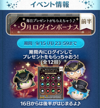 LINEディズニー ツムツム(Tsum Tsum)にて、2025年9月1日より「ログインボーナス前半」が開催されます。