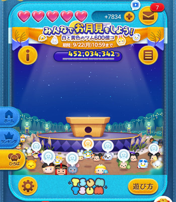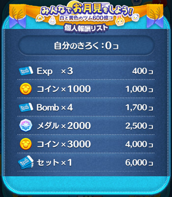今回のイベントは、「みんなでお月見をしよう~白と黄色のツム600億個~」となっています。
