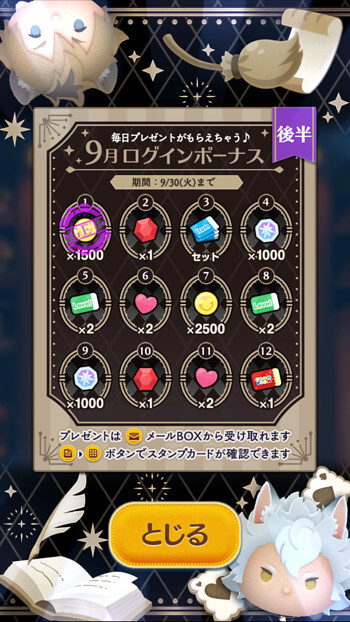LINEディズニー ツムツム(Tsum Tsum)にて、2025年9月16日より「ログインボーナス後半」が始まりました。