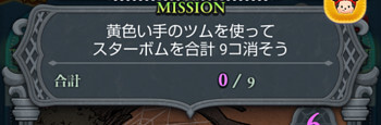 このミッションは、黄色い手のツムでスターボムを合計9個消すとクリアになります。