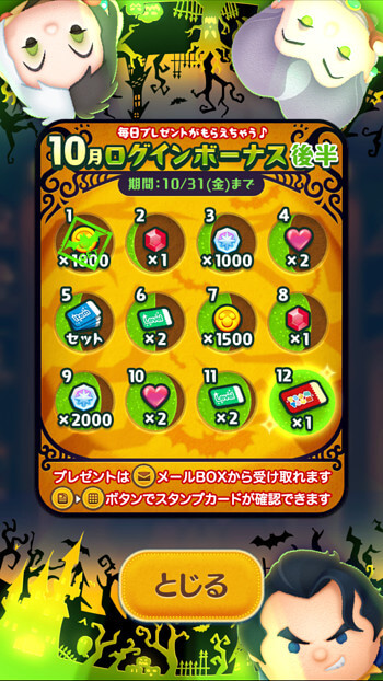 LINEディズニー ツムツム(Tsum Tsum)にて、2025年10月16日より「ログインボーナス後半」が始まりました。
