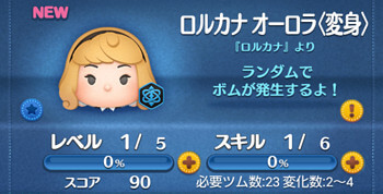 | 総合評価 | ロルカナオーロラ(変身)は、ランダムでボムが発生するよ!というボム発生系。 変身前は、ノーマルボムとインクボムが出ます。 変身後は、効果付きボムも出るため、ビンゴやイベントで使えそうですね。 さらに、ロルカナオーロラは変身後が強い! ボムを作ると反対側にもボムが1個生成されるので、1回で2個作ることができます。 それだけでなく、ボムを繋げることができ、消える際に間のツムも消すので大消去になることも! 同日追加のロルカナティンカーベル(変身)よりも扱いは難しいですが、文句無しの強さですね! |