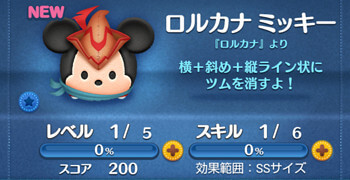 | 総合評価 | ロルカナミッキーは、横+斜め+縦ライン状にツムを消すよ!という消去系。 3方向に消しますが、一括消去扱いになります。 スキルマでだいたい30個前後消すので、消去数は少々少なめ。 その分、スキル発動数が軽いので、スキルループがしやすくなります。 めちゃくちゃ強いわけではないので無理に育てる必要はないですが、初心者の方でも使いやすいツムですね! |