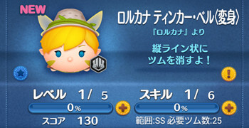 | 総合評価 | ロルカナティンカーベルは、縦ライン状にツムを消すよ!という消去系。 1本ラインのシンプルな縦ラインですが、変身前は少し少なめに消します。 変身後は、消去範囲が大きくなり、スキルマで40個前後消すという高威力! 変身中の追加効果として、ティンカーベルが少し大きくなり、1個で小ツム2個分の効果があります。 スキル自体はそこまで難しくないですが、変身するまでが大変・・・。 変身したあとは快適になるので、後半でスコアやコインを伸ばしていかなくてはいけません。 なお、超上級者の方は初見でフルアイテムを使用し、8000万点前後、30000コイン稼いでいました。 単純消去系でここまで出せるのは、シンプルに強いですね! |