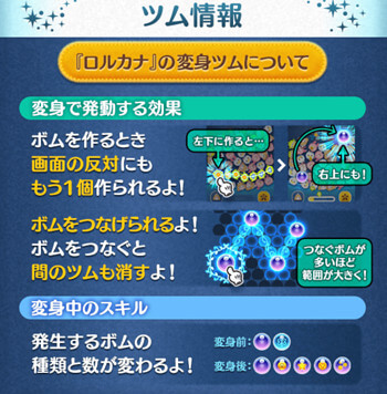 さらに追加効果が「ボムを作ると反対側にももう1個できる」「ボムを繋げられるよ!ボムをつなぐと間のツムも消すよ」と2つあります。