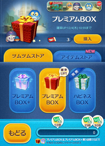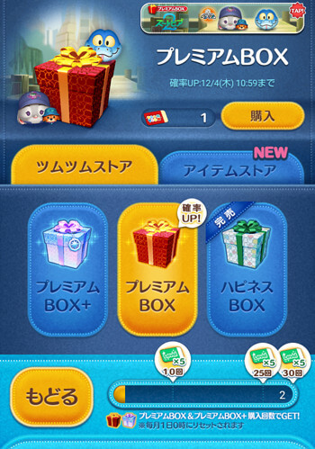 LINEディズニー ツムツム(Tsum Tsum)にて、2025年12月BOXボーナスとしてプレミアムBOX、プレミアムBOX+を10回、25回、30回引くとレベルチケットがもらえるキャンペーンが開催されています。