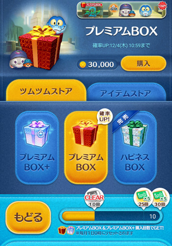 ・プレミアムBOX、プレミアムBOX+を10回引く ↓ ・レベルチケットを5枚ゲット |