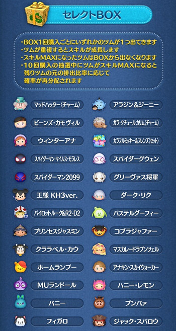 セレクトBOXに欲しいツムがいる場合、プレミアムBOXで狙うよりもセレクトBOXのほうが狙いやすいという特徴があります。
