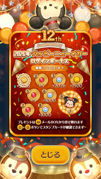 LINEディズニー ツムツム(Tsum Tsum)にて、2026年1月1日より「ハッピーニューイヤーログインボーナス」が始まりました。