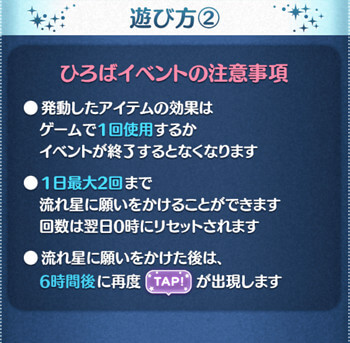 今回のひろばイベント「流れ星に願いをかけよう」の遊び方の基本・ルール・攻略法の情報です。
