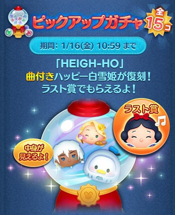 LINEディズニー ツムツム(Tsum Tsum)の2026年1月ピックアップガチャの2回目は、ラスト賞に曲付きハッピー白雪姫!