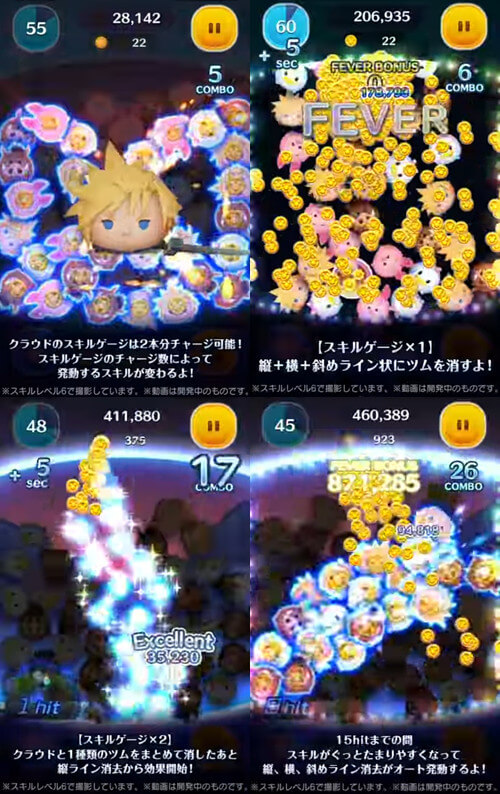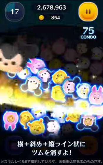 スキルを発動すると、横→斜め→縦と順番にツムを消します。