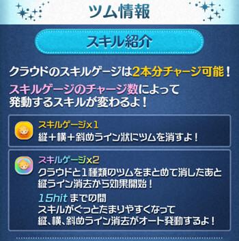 | スキル発動に必要なツム数 | 15~10 ※スキルレベルが上がる毎に減少 |