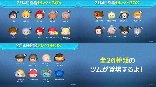LINEディズニー ツムツム(Tsum Tsum)の、2026年2月セレクトBOX(セレクトボックス/セレクトガチャ)は、キングダムハーツツムを中心に全26種がラインナップとなっています。
