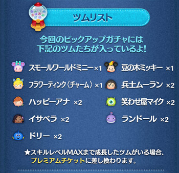 また、対象ツムの中でスキルマのツムがいる場合、プレミアムチケットに変換されます。