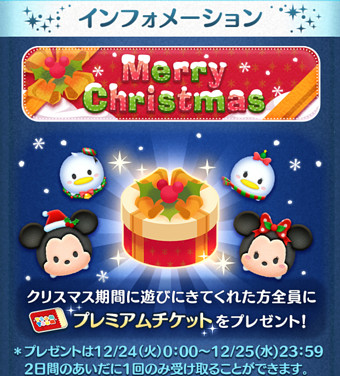 LINEディズニー ツムツム(Tsum Tsum)にて、2019年12月24日~25日の期間限定で、クリスマスプレゼントがもらえるキャンペーンが開催されます。